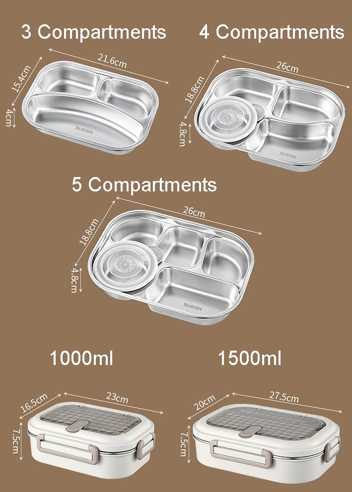 Available in 3, 4, and 5 compartments with a large capacity of 1000ml/1500ml, enough food for one person.