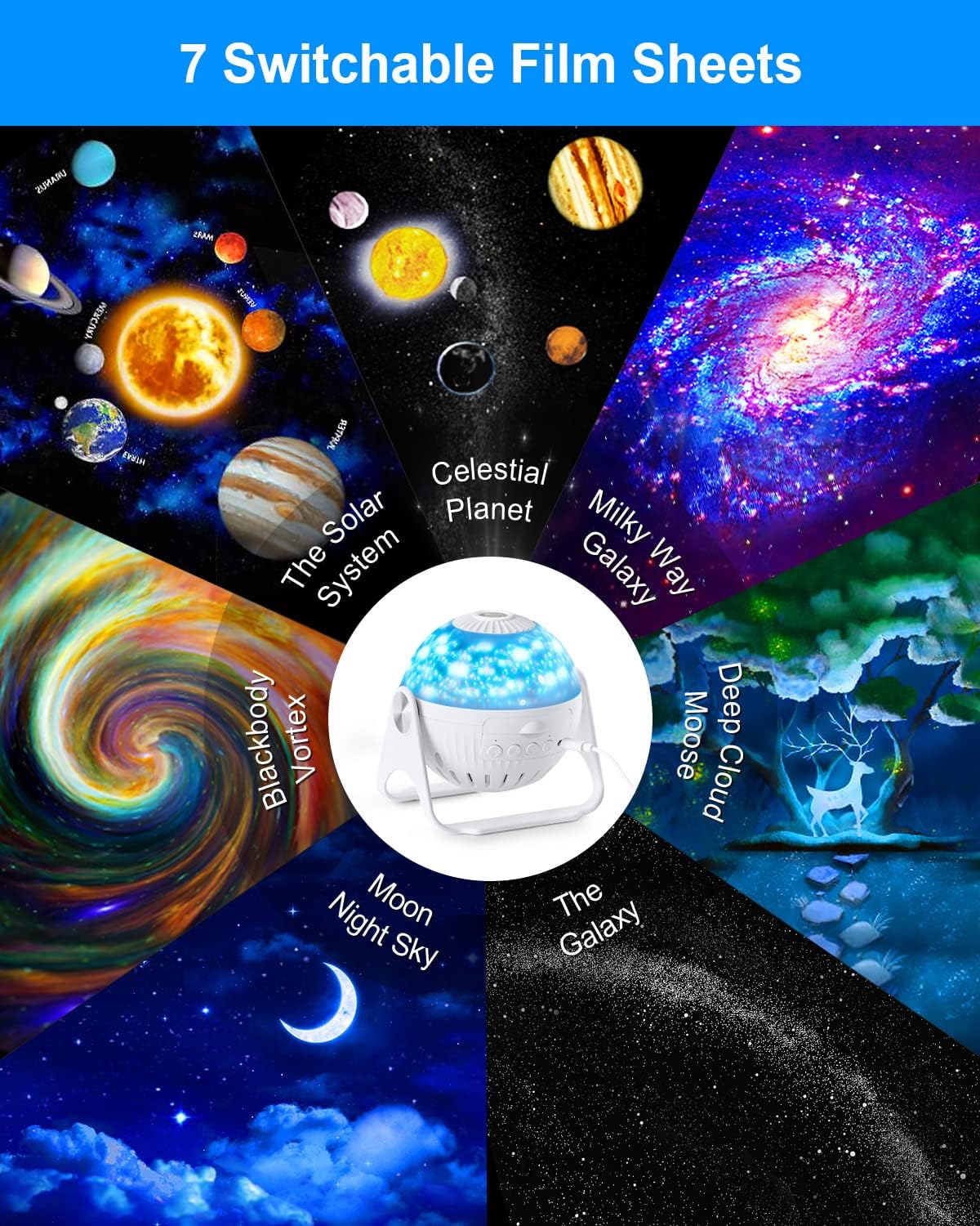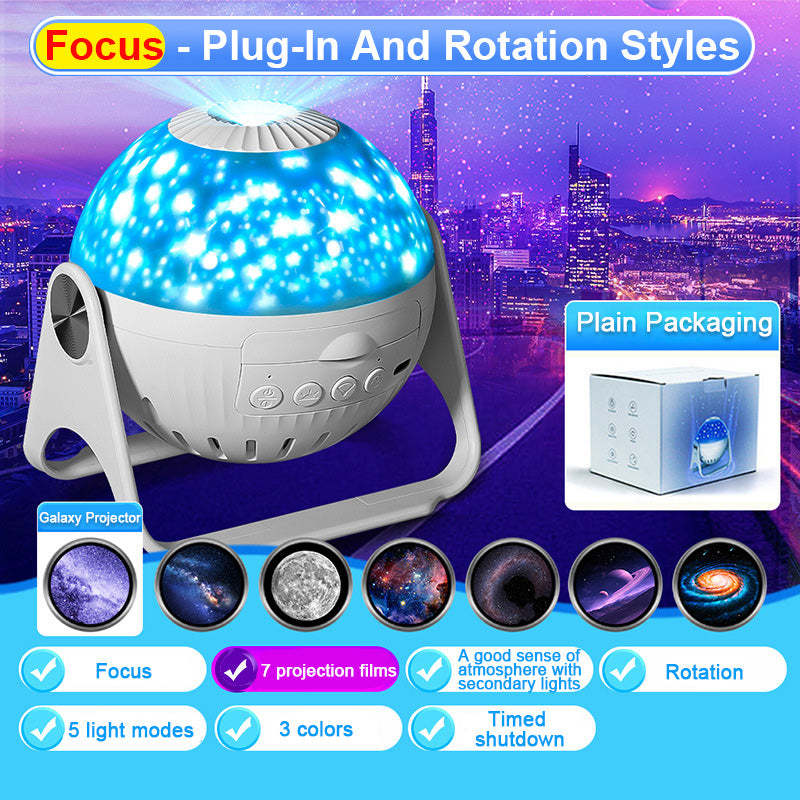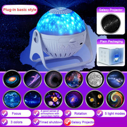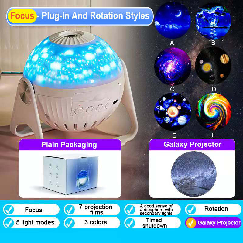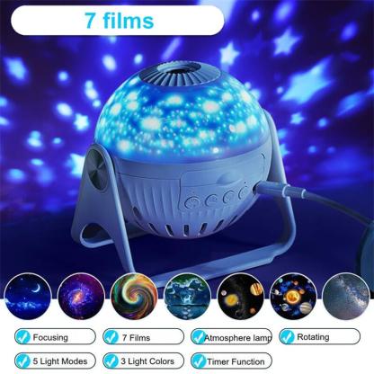 Galaxy planetarium projector support independently control the Movie Lights (press the second button to turn on/off) and Side Star Lights (press the third button to turn on/off/switch the light mode). No noise while working, create a soothing sleep environment. The fourth button can turn on/off the star rotation, and press 2 seconds for a timed shutdown (fixed for one hour) .You can change a disc one night, we offer 7 pcs disc enough to cover your needs for week.